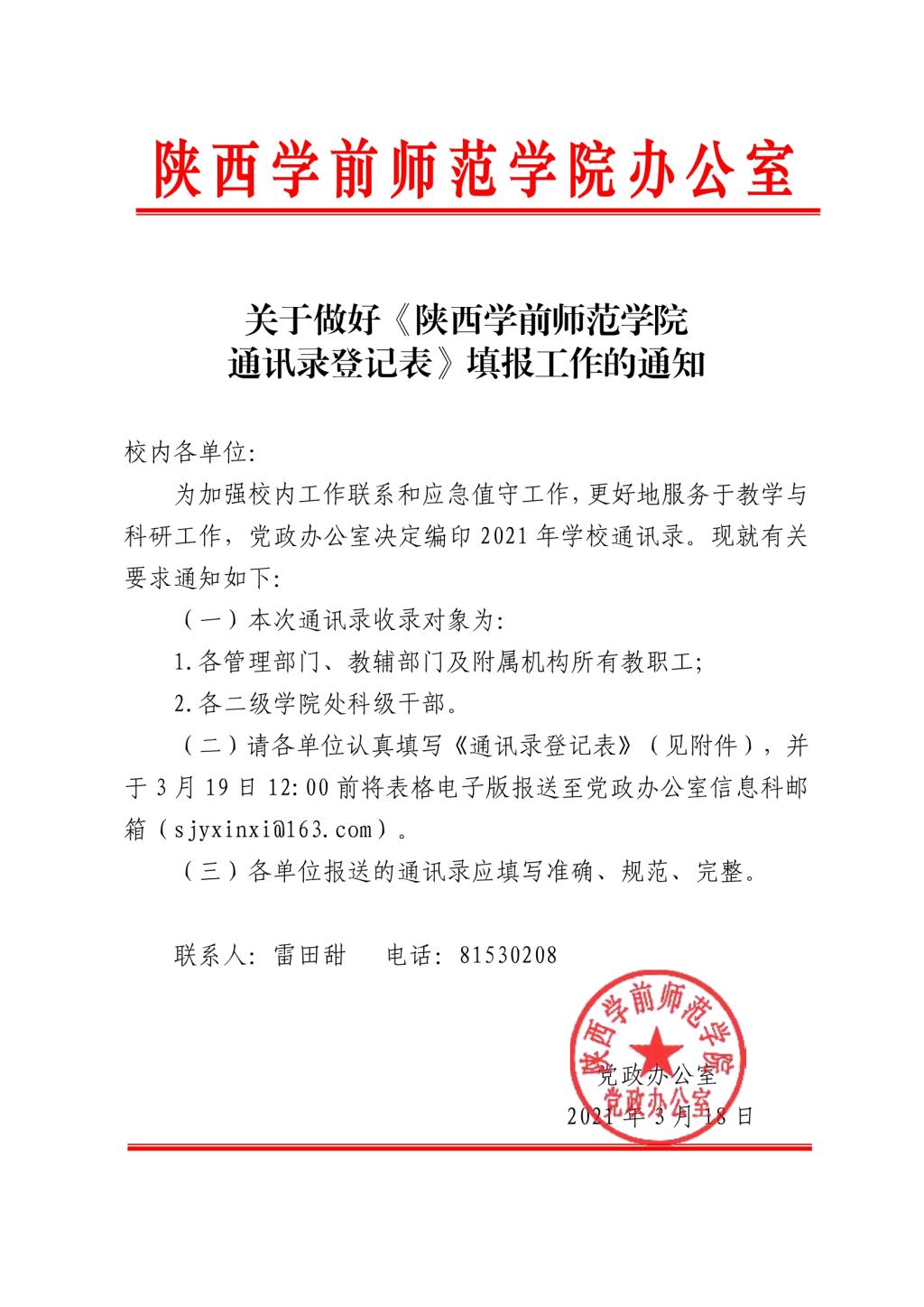 下一条:关于做好《陕西学前师范学院通讯录登记表》填报工作的通知