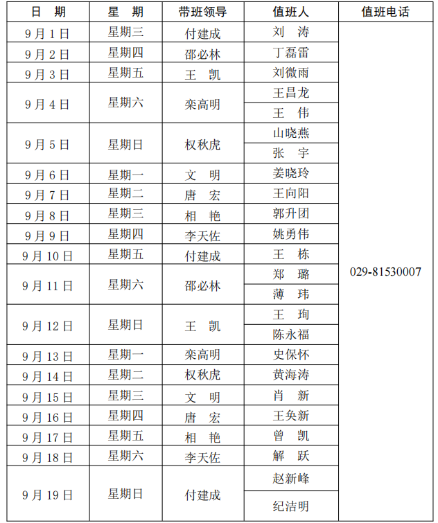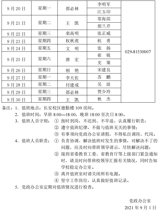 陕西学前师范学院长安校区值班表(2021年9月1日—9月30日)