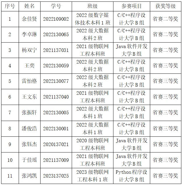 2024年4月29日,第十五届蓝桥杯全国软件和信息技术专业人才大赛软件类省赛的比赛结果刚刚揭晓,详见比赛官方网址https://dasai.lanqiao.cn/notices/1615/。信息工程学院共有11名学生获奖。具体获奖名单如下: