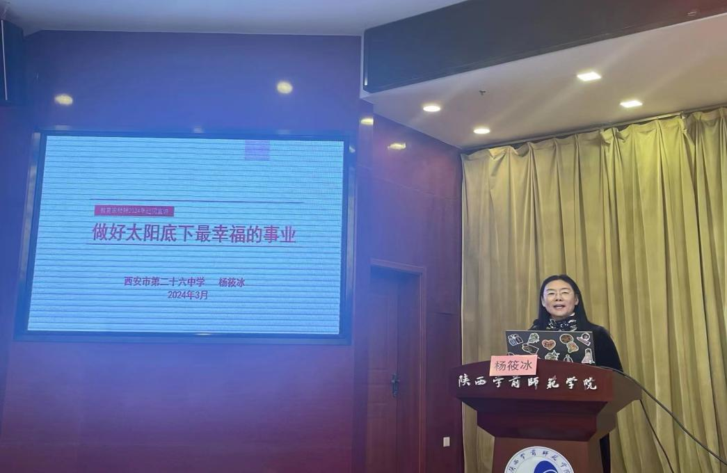 3月27日,教育部“弘扬教育家精神、争做新时代大先生”宣讲团成员、国家级教学名师、西安市第26中学英语教师杨筱冰应邀做客“英华名师讲堂”第28场,作了题为《做太阳底下最幸福的事业》的专题讲座。在参加省级教师培训的陕西省普通高中英语学科骨干教师89人、外国语学院师生代表100人在长安校区图书馆三楼学术报告厅参加了讲座,活动由外国语学院张慧军院长主持。