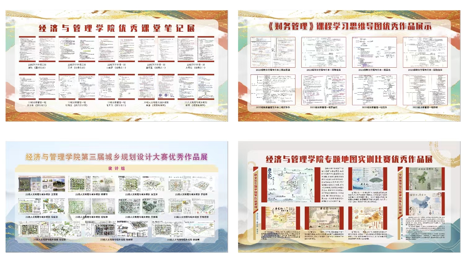 本次主题活动以宣传展板的形式对学院第三届城乡规划设计大赛参赛作品、《财务管理》课程思维导图、《专题地图实训》课程作业以及学生优秀课堂笔记等集中进行了展示。此外,学院还以“与榜样同行”为主题,通过微信公众号、主题展板等形式广泛宣传我院李嘉琪、赵妍、张文瑾、席妍、付芷晗、任永豪、杨妮、杨颖、任乐、赵昕宇、乔思甜、王佳妮、陈惠芳、王媛媛、王杨思琪、杨晨、员啸畅等各专业同学的个人先进事迹。