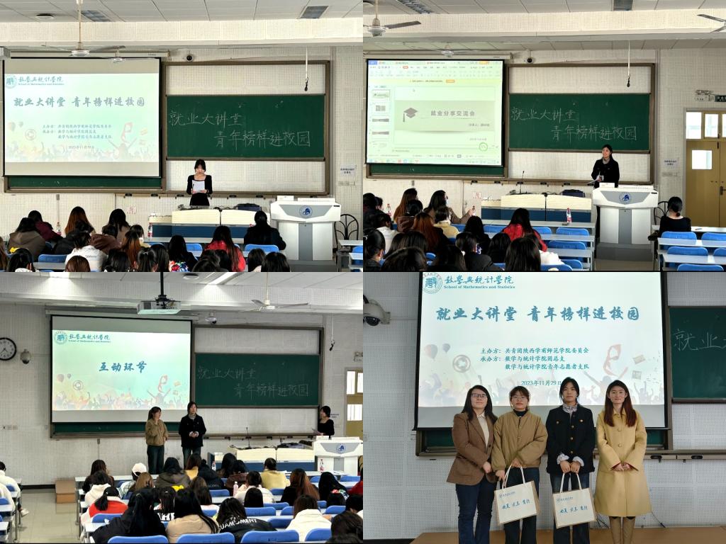 为拓宽学生就业渠道,拓展提升就业认知,全面提升就业综合能力,促进实现高质量就业,11月29日下午,“就业大讲堂 青年榜样进校园”宣讲会在二教楼A3阶梯教室成功举办。本次活动由校团委主办,数学与统计学院承办。活动特别邀请了数学与统计学院2022届、2023届数学与应用数学专业优秀毕业生雷寒珠、康祥艳进行就业经验分享,数统院一百余名学生参加了活动。