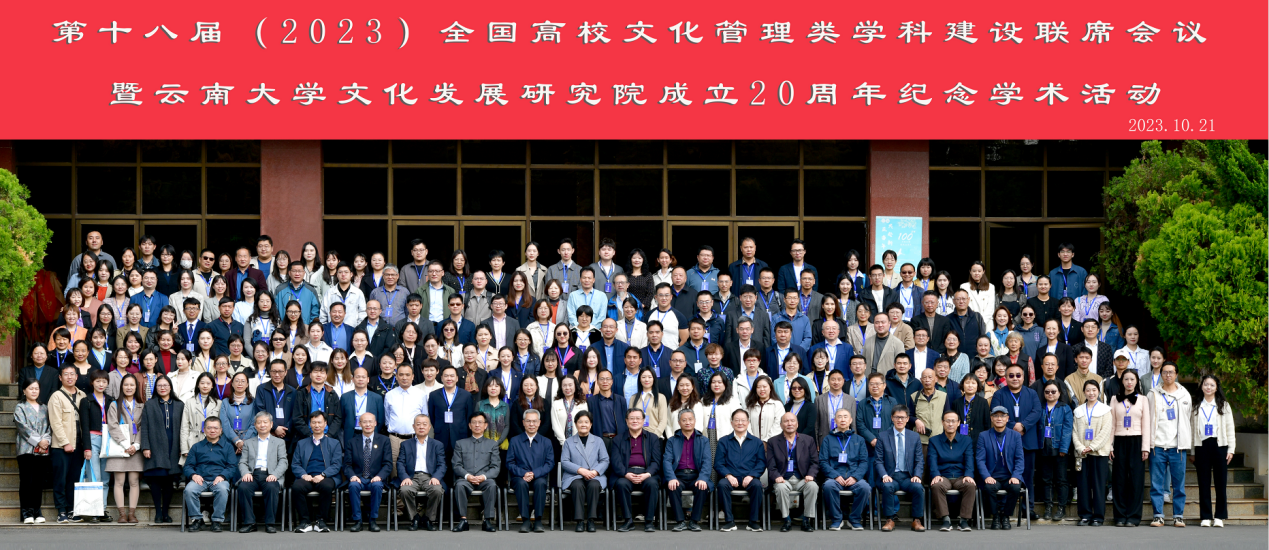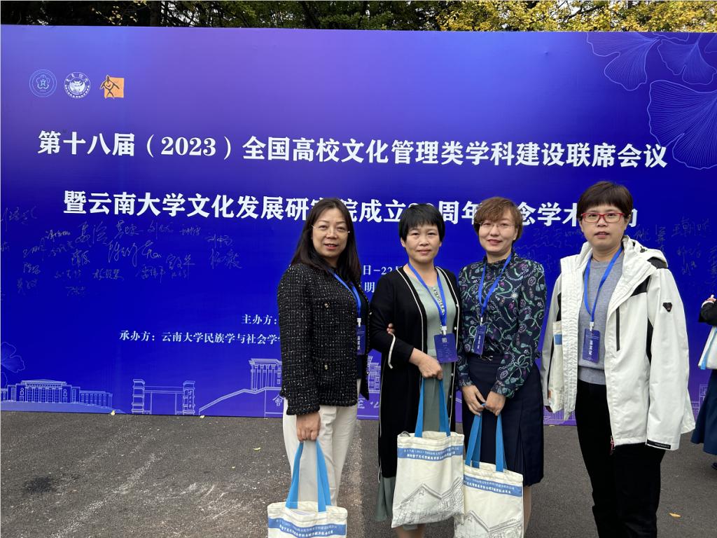 为学习贯彻习近平总书记振兴文化产业的重要思想和党的二十大精神,推动文化管理类学科主动融入国家战略,服务区域经济社会发展,2023年10月20日-22日,以“新形势下文化管理类学科与地方经济社会发展”为主题的“第十八届全国高校文化管理类学科建设联席会议”在云南大学召开。历史文化与旅游学院院长杜红艳教授、文化产业管理学科负责人王丽梅教授、文化产业本科专业负责人刘迎辉教授、中国传统文化“双创”实验室导师崔锐教授一行4人参加了此次会议。