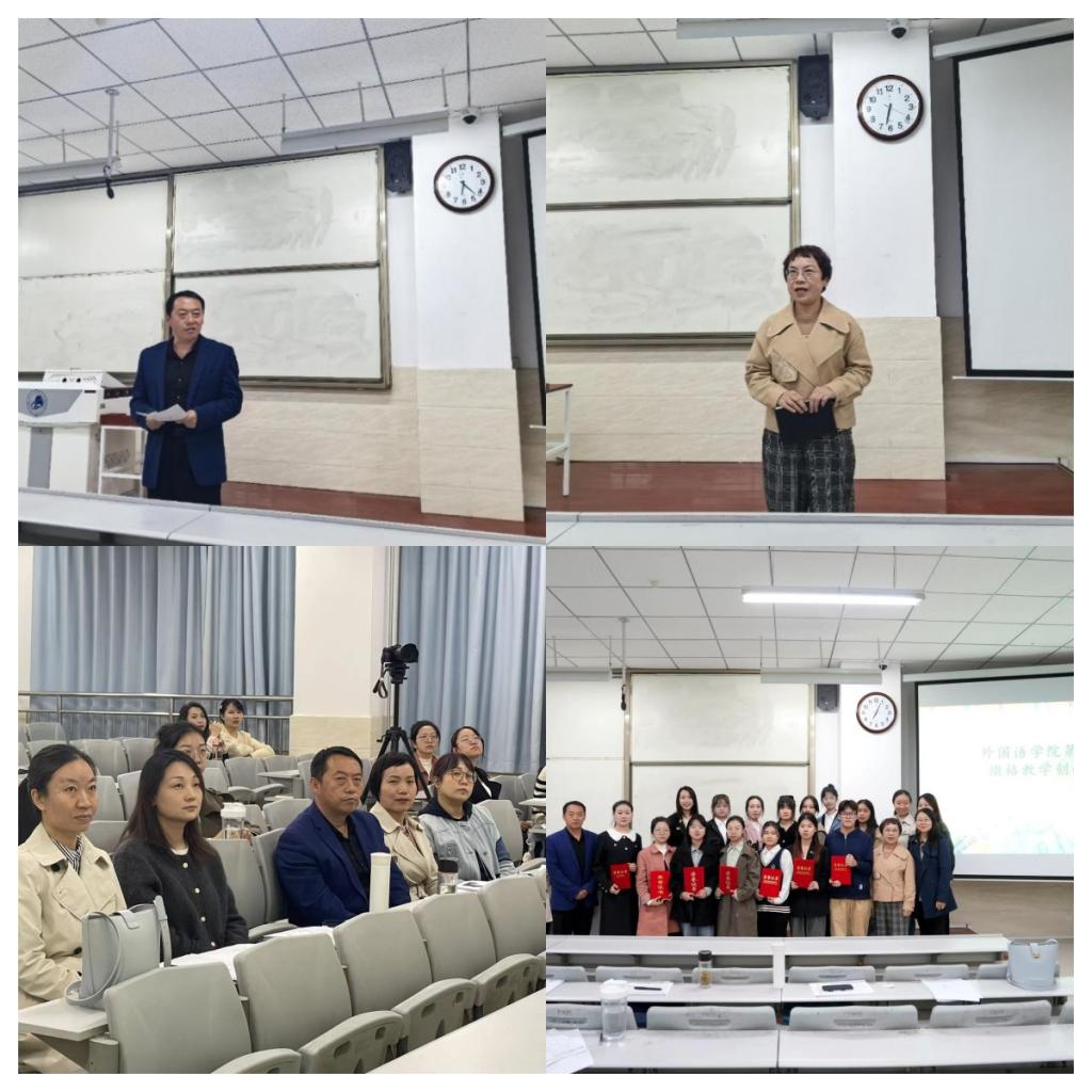 张慧军院长做了总结讲话,张院长对所有获奖选手表达了热烈的祝贺,并用“五个最”总结了此次比赛的突出特点:比赛时间最长、参赛人数最多、外请评委最多、活动组织最有序、比赛成效最显著。她还提到,参赛选手们准备充分、设计用心、基础扎实,能在教学设计中体现出与时俱进的新技术、新手段与新方法,体现了“以学生为中心”的教学理念,并能在教学设计中突出课程的育人元素。同时,张院长针对单词发音、课件制作、板书设计、应对突发事件能力等方面提出了意见和建议。最后,张院长对五位评委老师、教师指导团队以及志愿者同学的辛勤付出表达了衷心的感谢。