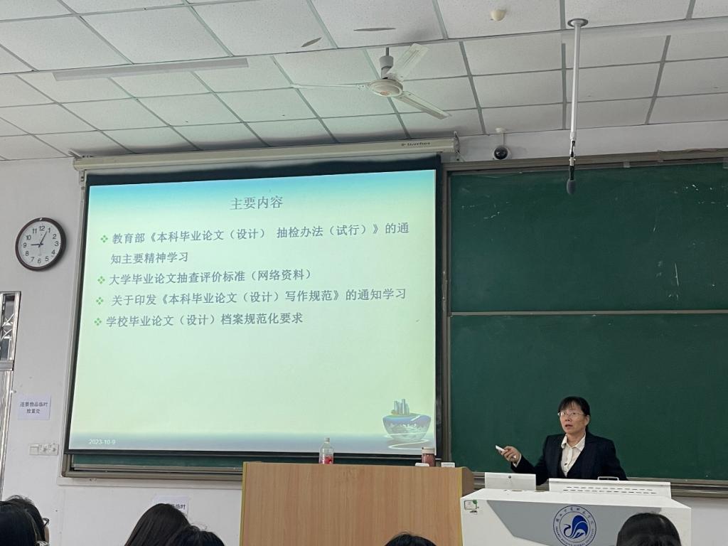 最后,副院长刘家瑛作总结发言,点明了毕业论文撰写的重要性,指出毕业论文是毕业生离开校园前的最后一项学习任务,要求各位老师严把质量关,各位同学积极认真开展毕业论文写作,选题要结合专业知识,严格按照学校毕业论文撰写规范执行,并且特别强调毕业论文的撰写须遵守学术道德规范,严禁抄袭、数据造假、请人代写等学术不端行为。
