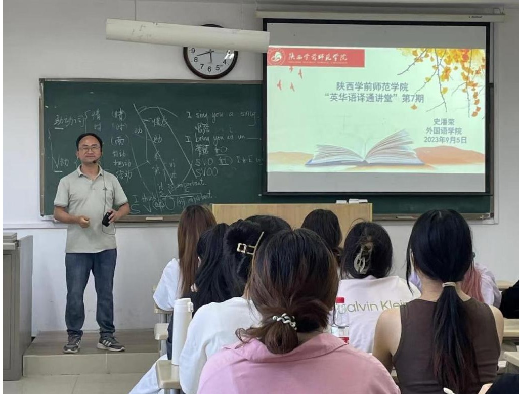 2023年9月5日,陕西学前师范学院外国语学院举办“英华语译通讲堂”第7期讲座,主讲嘉宾为中国国学双语研究会会员、陕西译协理事、西京大学史潘荣老师。史老师结合汉英笔译实践翻译任务,对翻译主体、翻译方法、翻译类型、翻译目的等方面进行了针对性讲授,21级、22级翻译系全体本科生在现场聆听报告。讲座由翻译系主任吴迪老师主持。