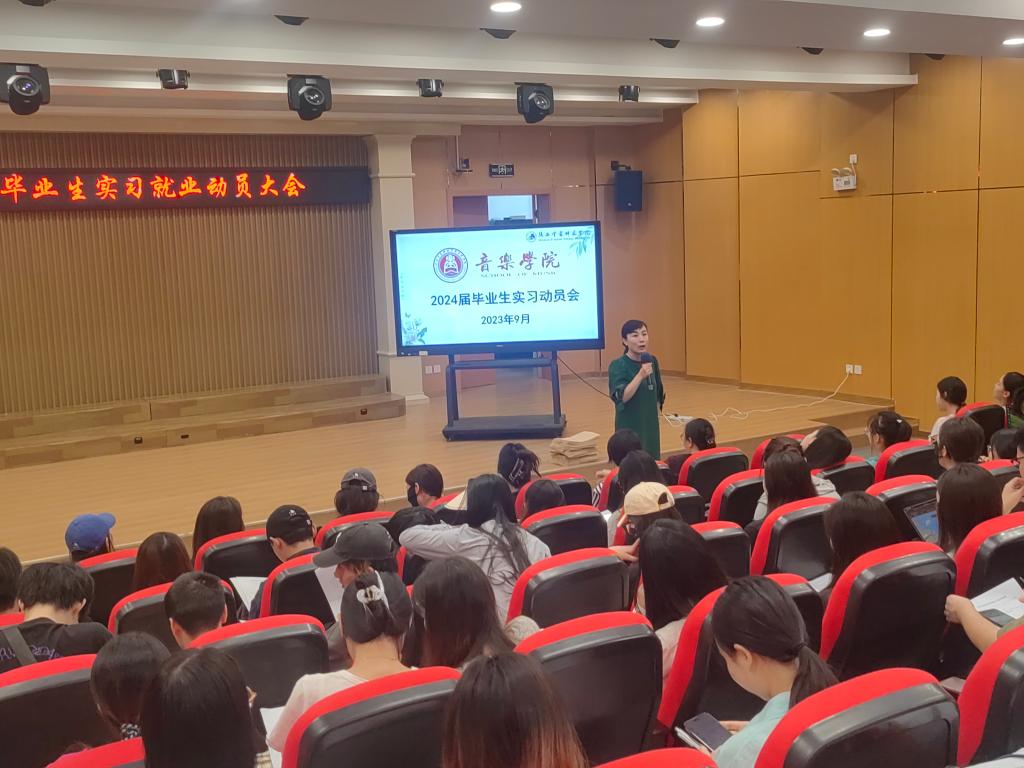 为帮助2024届毕业生将专业理论知识运用到实践中,明确实习要求,把握实习方案,引导同学们做好实习前的各项准备,确保毕业生实习、就业工作的顺利展开,9月15日上午音乐学院在大学生艺术教育中心举办了教育实习就业动员大会。实习带队教师、毕业班辅导员及学院2024届毕业生参加本次会议。