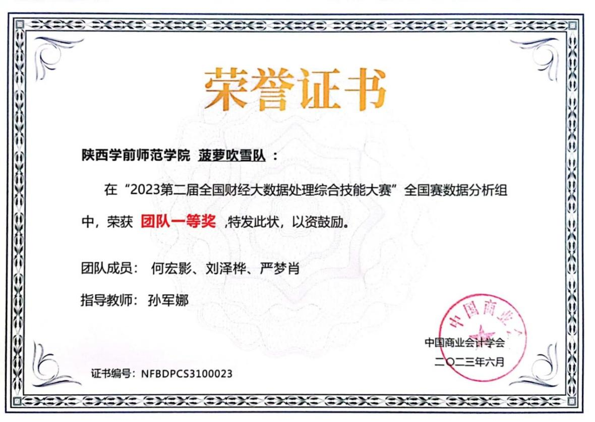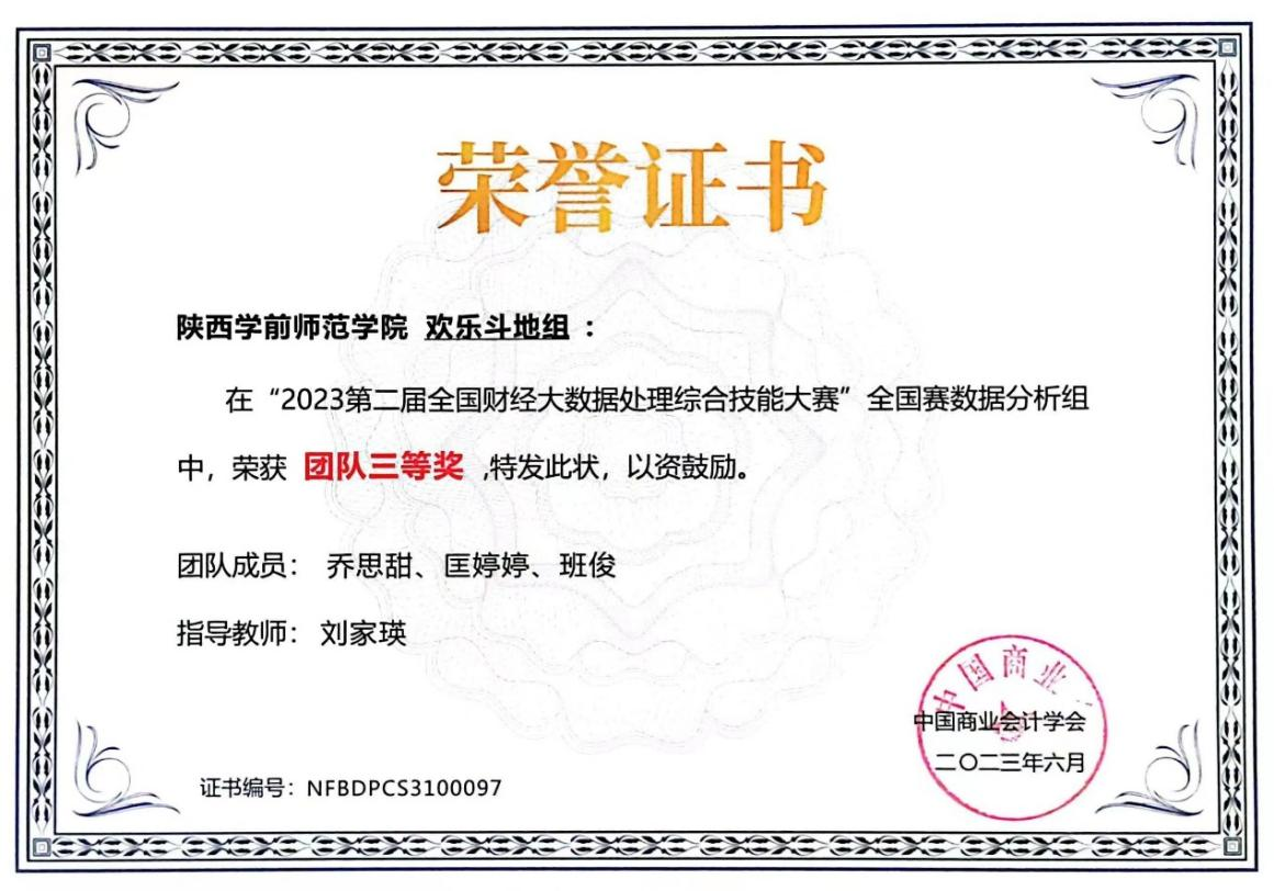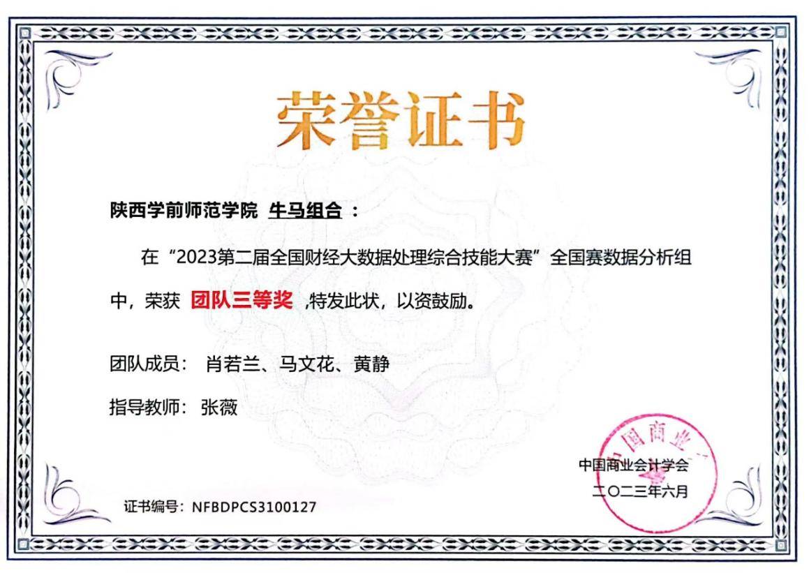由中国商业会计学会主办,深圳希施玛数据科技有限公司承办的第二届全国财经大数据处理综合技能竞赛全国赛(数据分析组)于近日圆满落幕。本届大赛有来自全国26个省、市、自治区的279家本科院校、4469名学生参加。竞赛内容融入大数据、人工智能等现代信息技术到财务数据分析中,经济与管理学院特邀信息工程学院的老师和学生参与,共同组队,强强联合,优势互补。经过激烈角逐,参加国赛的6支队伍全部获奖,其中,一等奖一项,二等奖三项,三等奖二项,成绩在参赛院校中名列前茅。