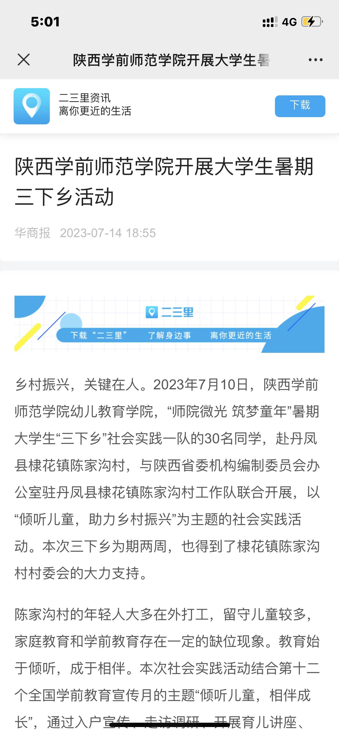 8.7月20日《棣花镇政府官微(美丽棣花)》 丹凤县棣花镇助力陕西学前师范学院开展“倾听儿童,助力乡村振兴”大学生暑期“三下乡”社会实践活动