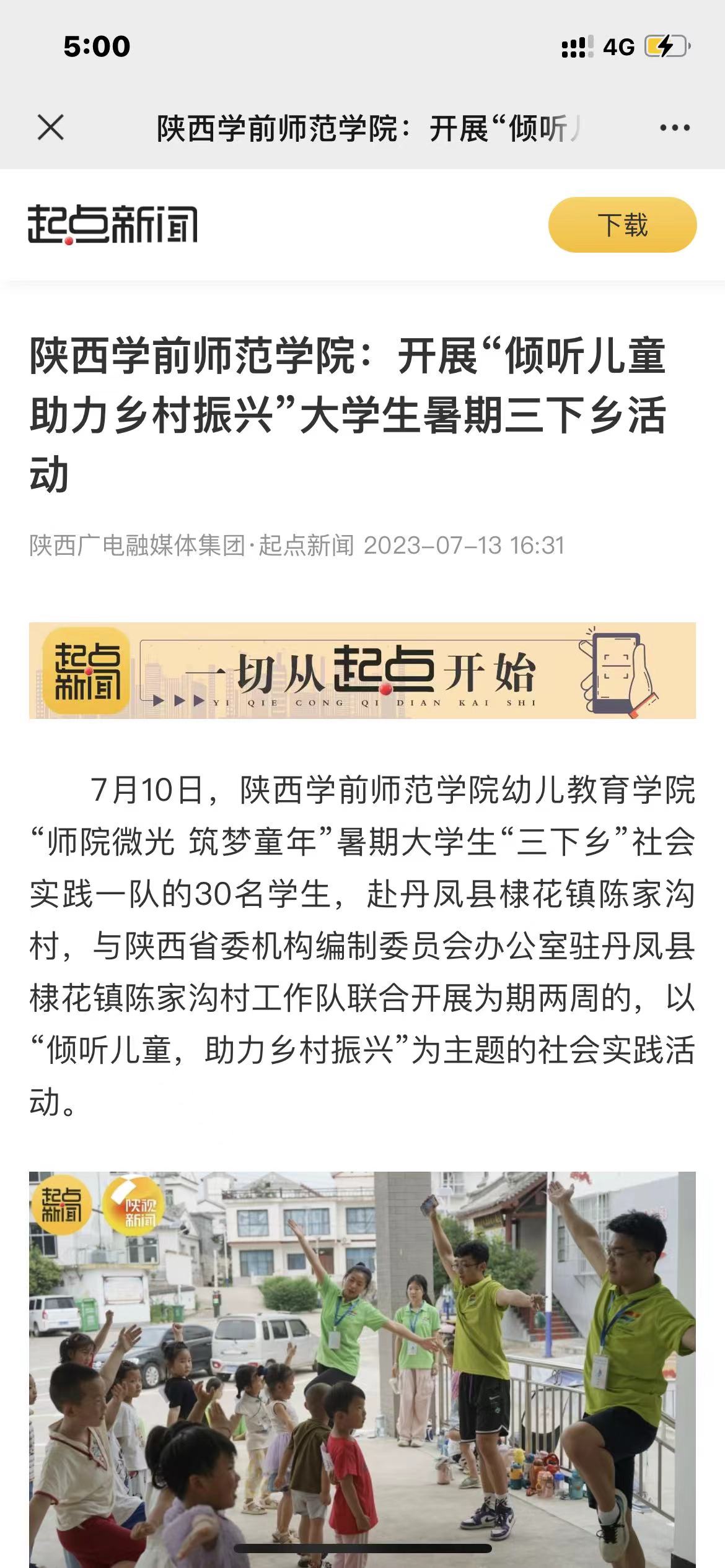 3.7月13日《陕西广电融媒体集团·起点新闻》陕西学前师范学院:开展“倾听儿童 助力乡村振兴”大学生暑期三下乡活动