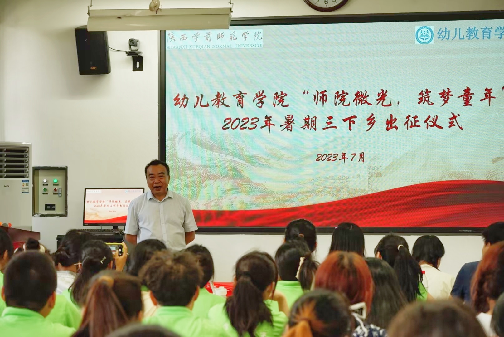 陕西学前师范学院幼儿教育学院“师院微光,筑梦童年”暑期三下乡活动出征仪式于2023年7月10日在启真楼315报告厅举行,我院的两支实践队分别赴往商洛市丹凤县和延安市延川县开展三下乡社会实践活动。
