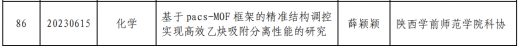 近日,陕西省科协发布了《关于2023年陕西省科协青年人才托举计划项目立项的通知》(陕科协发〔2023〕事企字8号),化学化工学院薛颖颖博士申报的“基于pacs-MOF框架的精准结构调控实现高效乙炔吸附分离性能的研究”项目获批,项目编号:20230615。