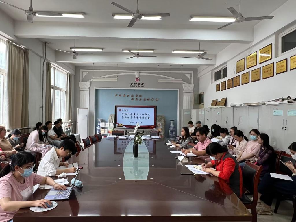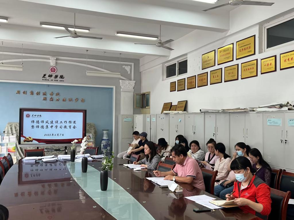为深入学习贯彻习近平新时代中国特色社会主义思想和党的二十大精神,落实《陕西学前师范学院“以德育德 两代师表共同塑造”行动方案》,不断提高教师道德修养,弘扬新风正气,树立教师良好形象,提升教育教学质量。6月7日下午,美术学院在会议室召开了师德师风建设专题教育活动。全体教师参加会议,会议由美术学院党委副书记(主持工作)文竹主持。