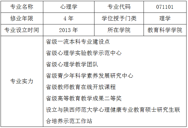 心理学是建校以来的传统优势学科和重点建设学科之一,1978年开始心理学教学与专业建设工作。2003年获准招收心理咨询专业专科生;2013年获准招收心理学专业本科生;2014年获批省级教学团队;2015年获批校级综合改革试点专业;2016年获批省级实验教学示范中心;2017年,心理学专业遴选为陕西省本科“一流专业”培育项目;2019年,心理学专业获批为陕西省本科“一流专业”建设项目。2018年与陕西师范大学联合培养心理健康教育专业硕士研究生工作。