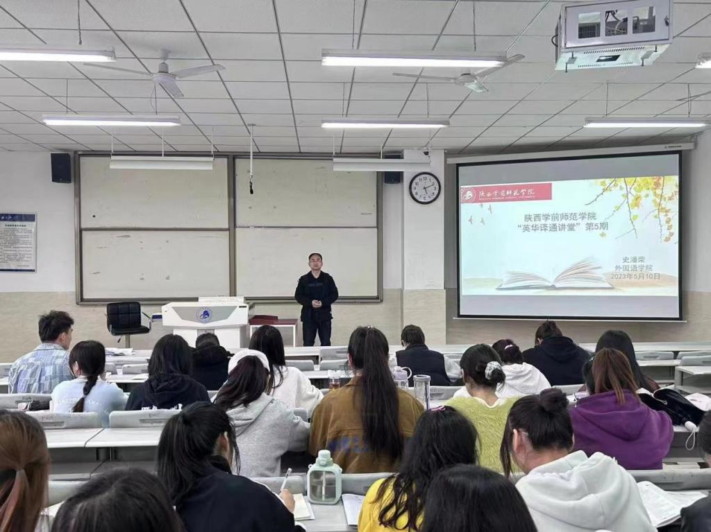 2023年5月10日下午,外国语学院邀请西京大学史潘荣老师做了一场题为《中国古典诗歌英译的科学与艺术》的讲座,外国语学院翻译专业全体本科生在现场聆听报告,活动在4号教学楼第四阶梯教室举行,由翻译系主任吴迪老师主持。