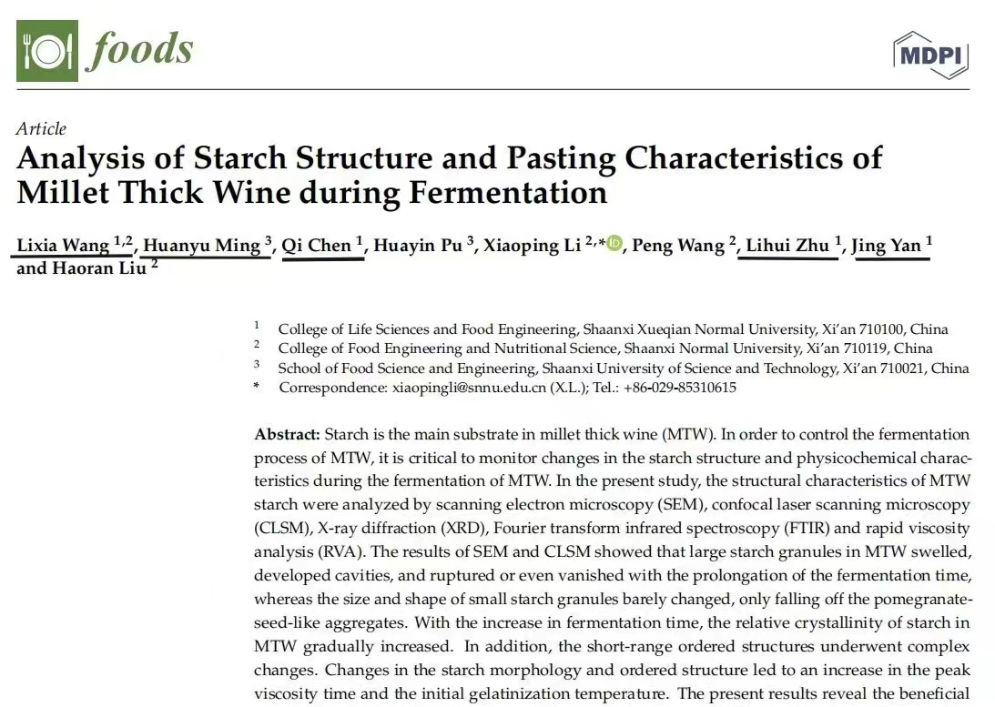 近日,生命科学与食品工程学院副院长王立霞博士带领2018-2021级食品科学与工程专业本科生在国际著名期刊《FOODS》(SCI二区,IF=5.561)上发表了题为“Analysis of Starch Structure and Pasting Characteristics of Millet Thick Wine during Fermentation”的学术论文。