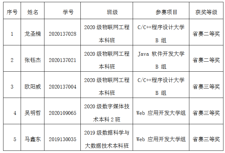 2023年4月23日,第十四届蓝桥杯全国软件和信息技术专业人才大赛个人赛省赛的比赛结果刚刚揭晓,详见比赛官方网址https://dasai.lanqiao.cn/notices/1447/。信息工程学院共有5名学生获奖。具体获奖名单如下: