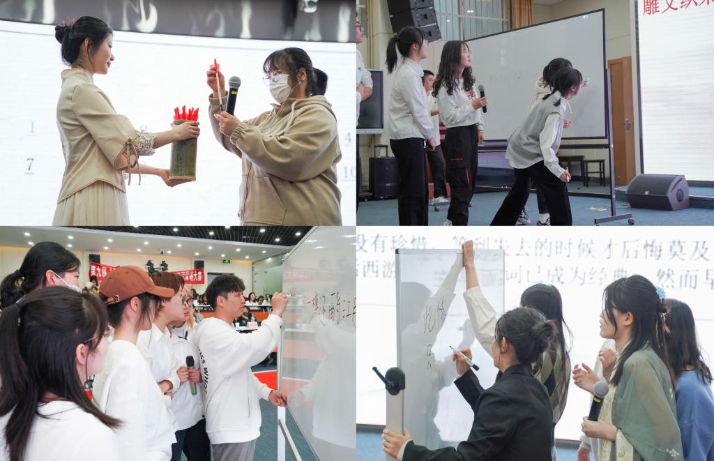 本次大赛经过前期缜密周全的初、复赛选拔,共有10名个人选手和6支团队乘风破浪、崭露头角,来到决赛现场。一首《战台风》余音绕梁、慷慨激昂,一声声行云流水、荡气回肠的古筝声,拉开了本次诗词大赛的帷幕。个人赛分为明察秋毫、大浪淘沙、诗意沁香三个环节,分别为判断题目并阐释原因,根据所给意象背诵相关诗句以及对诗词情景进行赏析,个人选手们博观约取、厚积薄发,在诗词经典中将风采展现得淋漓尽致;团体赛分为行云流水、雕文织采、点墨成诗三个环节,分别为根据所给意象进行诗句接龙,根据题目写出相应诗句以及根据图画和关键词创作诗词,各队伍群策群力、同力协契,队伍间亦棋逢对手、互不相让,彼此间展开一场精彩激烈的角逐之战。赛末,一曲《越人歌》独唱表演,音色优美,独具风韵,将诗词大赛的激情再次推向高潮。